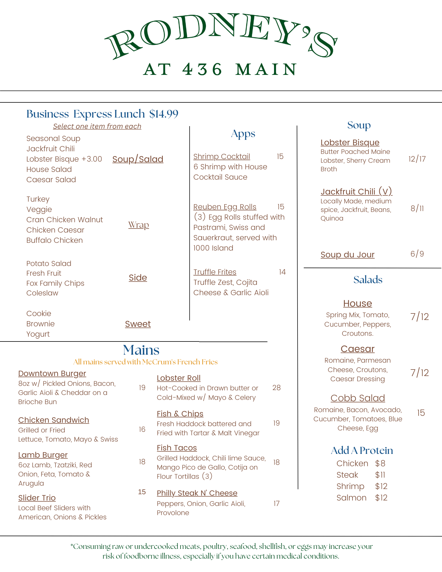 Discover the delicious offerings at Rodney’s by viewing our lunch, dinner, and bar menus. Find your next favorite dish or drink with just a click!